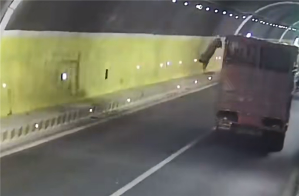 车主李某驾驶重型货车出发前未对笼箱进行扎实捆扎,车上运载的活猪趁机从笼箱“越狱”而出,摔落在隧道左侧路面。