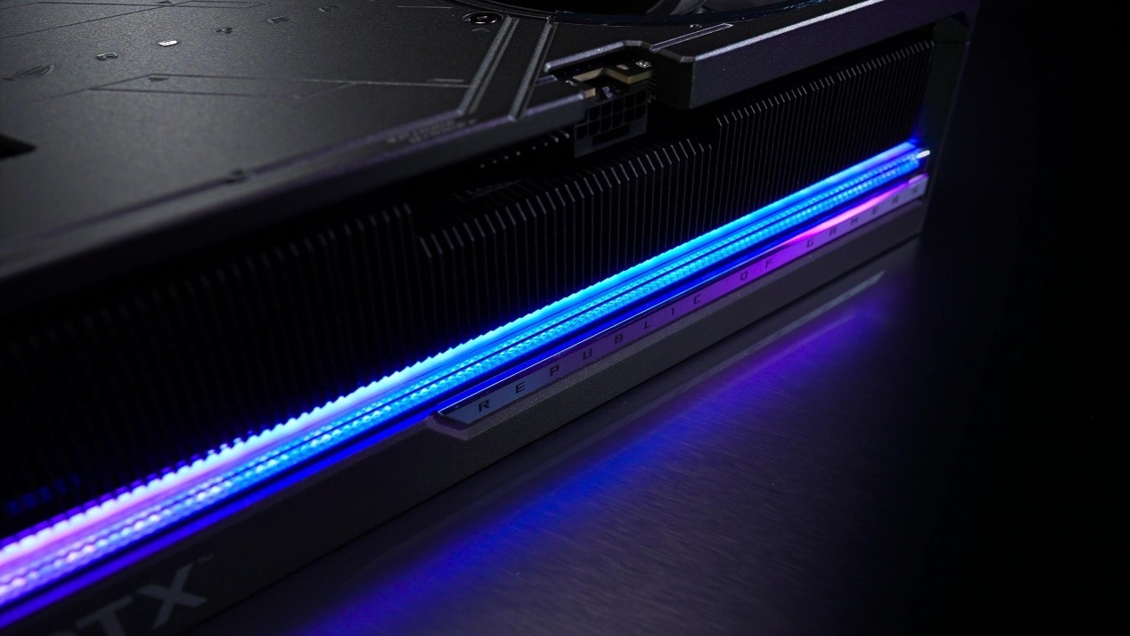 在外观上,显卡侧面有一条非常长的ARGB灯带,它采用钻石切割的柔光效果,视觉效果酷炫而不过分张扬,支持AURASYNC神光同步,与华硕的其他电竞设备一起同步灯光,提供无限的灯光与色彩可能性,打造个性化主机!