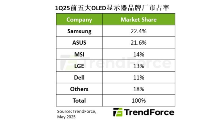 华硕第一季度的市占率从第四名跃升至第二名,与三星的差距不到一个百分点,更在二、三月达到单月出货量第一。华硕投入众多资源于OLED显示器,并尝试产品各种可能性,如便携式双屏显示器,完整布局产品线。