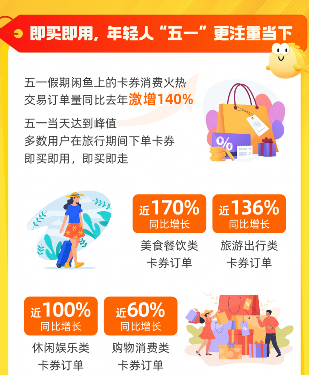 近年来,卡券消费成为越来越多年轻人假期出游必备。5月9日,闲鱼发布最新的卡券消费数据,呈现假期消费者出游趋势。数据显示,五一期间卡券消费火热,订单同比激增140%,尤其在五一当天达到了峰值,其中,美食餐饮类订单同比增长最高,达到了170%,旅游出行类、休闲娱乐类增长也均超过100%。