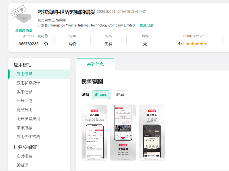 七麦数据显示,“考拉海购”App的iOS版下架时间是2025年3月31日15点,安卓版没有明确下架时间,但在小米应用商店、vivo应用商店、应用宝等平台上,“考拉海购”均处于下架状态。