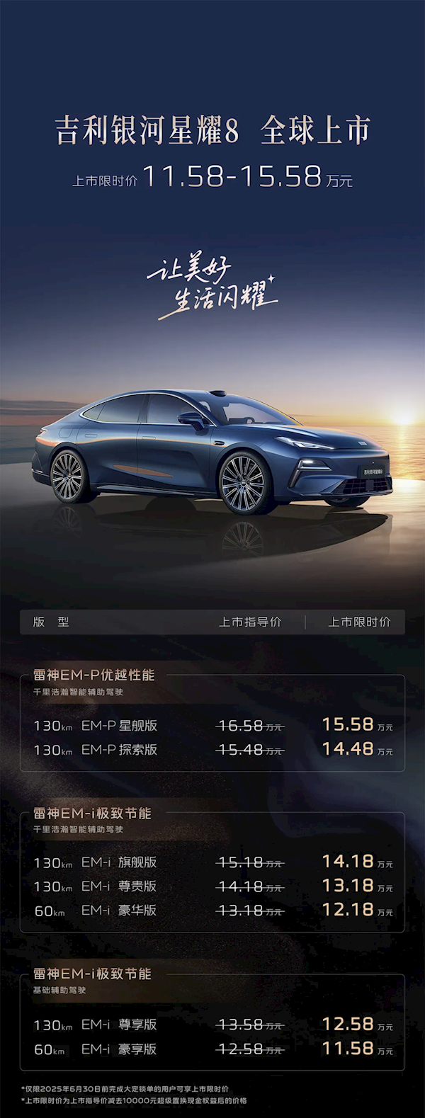 快科技5月9日消息,今日晚间,吉利银河星耀8 EM正式上市,共推出7款车型,指导价区间为12.58-16.58万元,车辆全系限时现金优惠1万元,优惠后售价区间11.58-15.58万元。