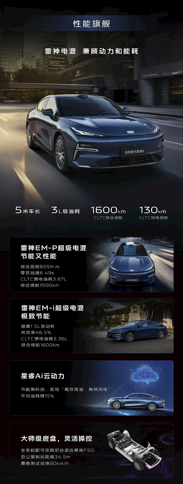EM-i动力系统搭载1.5L自然吸气发动机强调极致节能,单电机最大功率238马力,系统综合功率350马力,传动系统匹配单挡DHT变速箱,CLTC纯电续航里程有60km和130km两种,CLTC综合续航则分别为1500km和1600km,馈电油耗低至3.36L/100km。