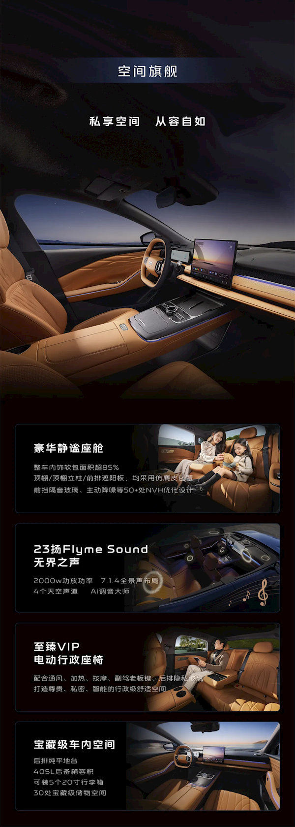 整车内饰软包面积超85%,前档为隔音玻璃,车内还有主动降噪等50+处NVH优化设计;同时,车辆限时赠送价值1.28万元23扬Flyme Sound音响系统,以及配备通风、加热、按摩、副驾老板键、后排隐私玻璃的至臻VIP电动行政座椅。
