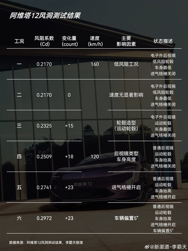 但让很多人意外的是,测试并非简单测了单一工况,而是多达六种,非常清晰地揭示了车辆不同状态下的风阻系数变化,因此有博主称与其说这是一场测试,不如说给公众上了一堂生动的科普课。