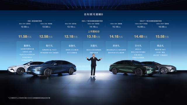 5月9日,全球新一代豪华中高级电混轿车——吉利银河星耀8(配置|询价)正式上市。新车推出极致性能雷神EM-P 2个版型、极致节能雷神EM-i 3个版型,该5个版型标配千里浩瀚智能安全辅助驾驶;同时为满足用户对辅助智驾的自由选择需求,推出雷神EM-i 2个版型标配基础辅助驾驶。吉利银河星耀8上市限时价11.58~15.58万元(仅限2025年6月30日前,完成大定锁单的用户,可享上市限时价),同时也为用户推出丰厚的限时购车权益。