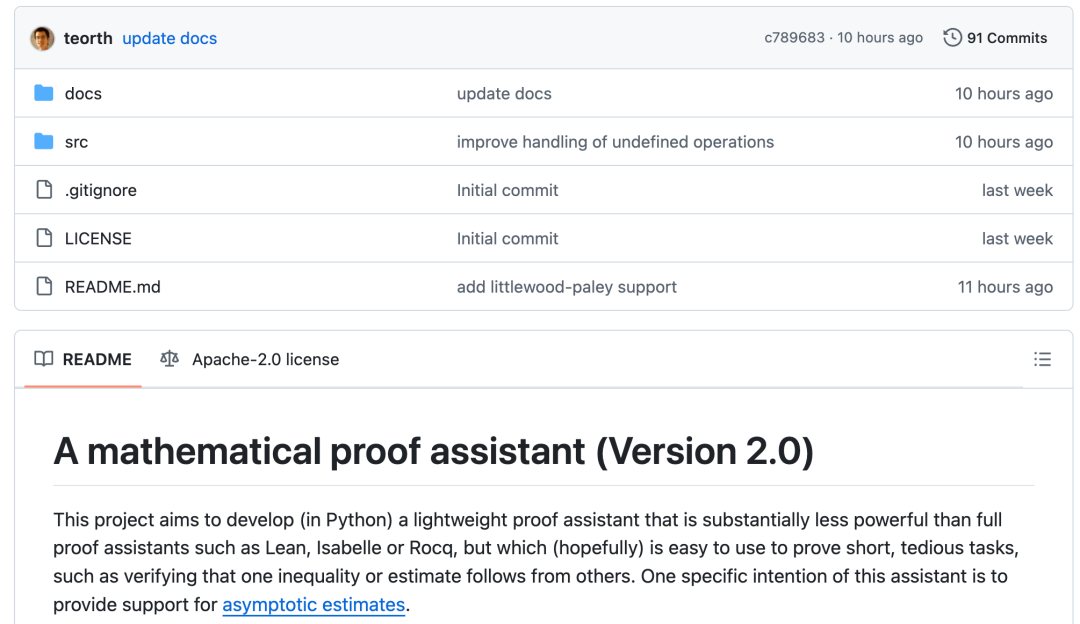 根据项目简介,这是一个利用 Python 开发的轻量级证明助手,其功能远逊于 Lean、Isabelle 或 Rocq 等完整证明助手,但希望它能够轻松用于证明一些简短而繁琐的任务,例如验证一个不等式或估计是否由其他不等式或估计推导出来。该助手的一个具体目标是为渐近估计(asymptotic estimates)提供支持。