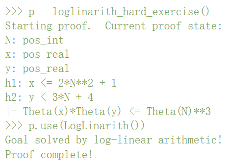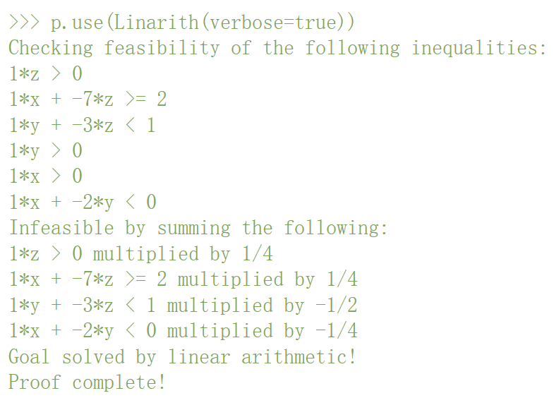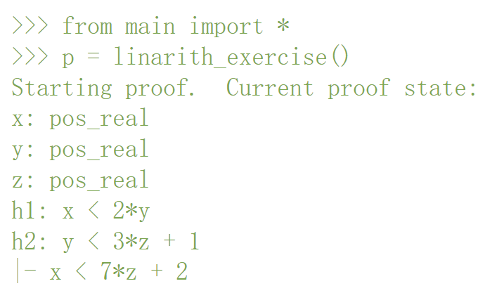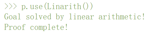 证明助手的工作方式是:用户指示助手使用各种「策略」来简化问题,直到问题得到解决。在本例中,该问题可以通过线性算法求解,具体形式化为「Linarith ()」策略: