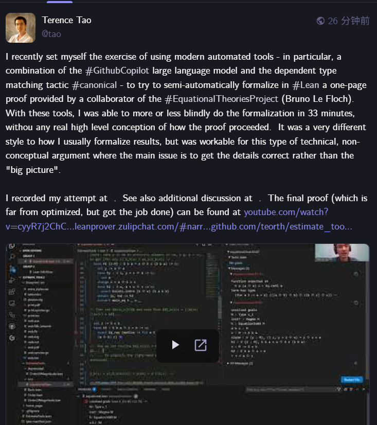 他最近尝试了一个小实验:尝试利用现代自动化工具(如 GitHub Copilot 和 Lean 证明助手)来半自动地形式化一个一页纸的数学证明。这个证明来自他在 Equational Theories Project 中的合作者 Bruno Le Floch。