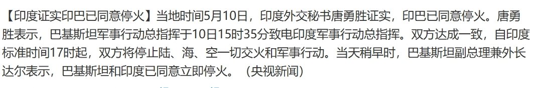 周五,军工股熄火,包括老赵在内的大部分博主都能看出来,印巴可以亮剑,但是不会持续升级,他们跟俄乌还不一样,最大的区别就是阿三不比大毛,大毛有自己的军工体系,阿三完全就是买西方的武器,而巴铁完全用的是熊猫家的武器,这一波PK直接代表了东西方火力的PK,一个回合打下来,西方大哥们马上打电话给阿三,可别打了,再大就丢大人了。所以,这一次印巴冲突最大受益者就是熊猫武器,让全世界看到了其强悍的战力,对军工构成长期支撑,后面估计会有不少国家来采购。
