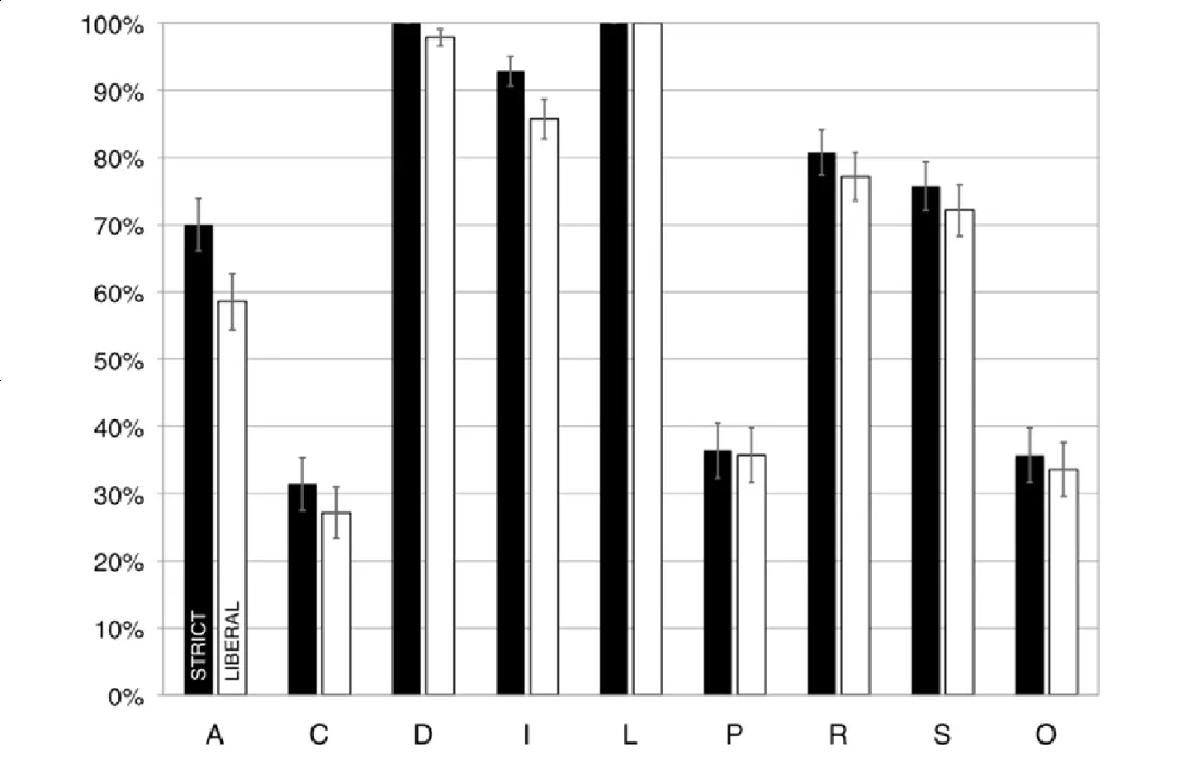 根据严格(深色条)和宽松(浅色条)标准评分的违反心理沟通原则的PPT百分比。A适当的知识;C兼容性;D可区分性;I信息变化;L有限容量;P感知组织;R相关性;S显著性;O过度决定