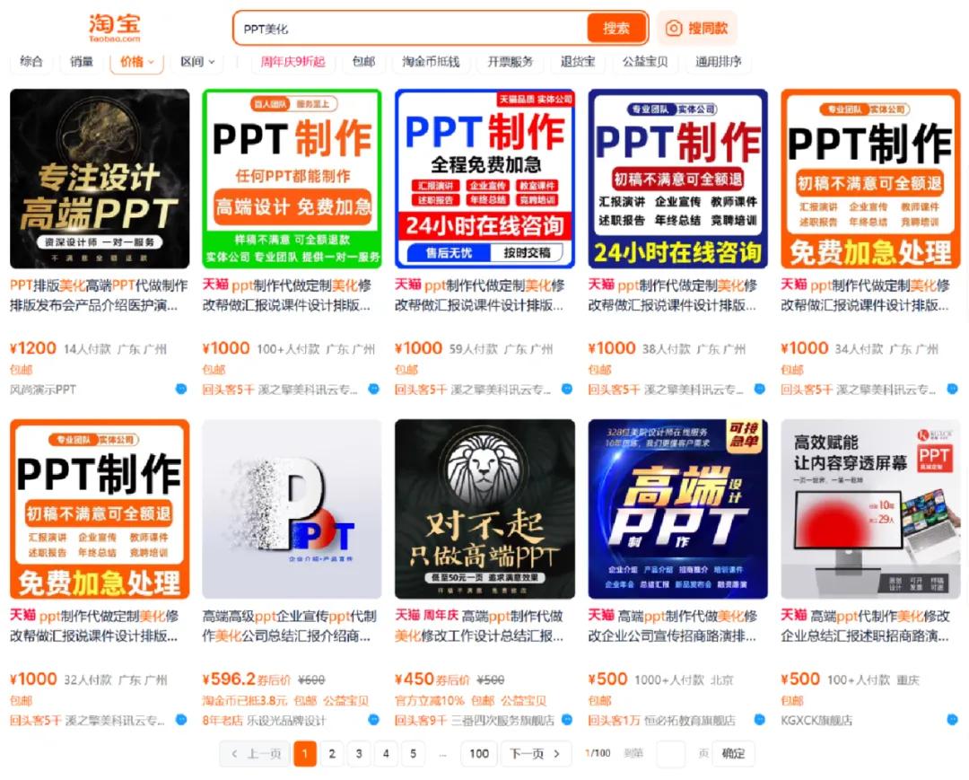 淘宝搜“PPT美化”,显示出100页搜索结果 / 淘宝网