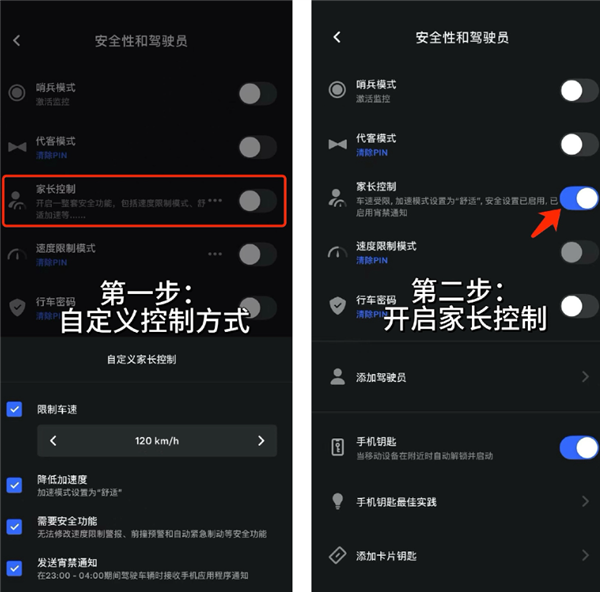据介绍,家长在该功能中可以设定车辆的最高速度、限制加速度,还可一键开启包括紧急制动辅助、盲点警报、车道偏离辅助等在内的一系列主动安全功能。