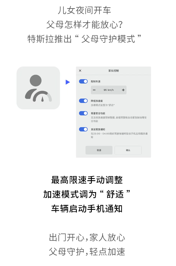 陶琳表示,刚拿到驾照的孩子独自开车,哪怕只是几公里,做父母的也难免会担心,特斯拉的家长控制功能,正是为这样的场景设计的。