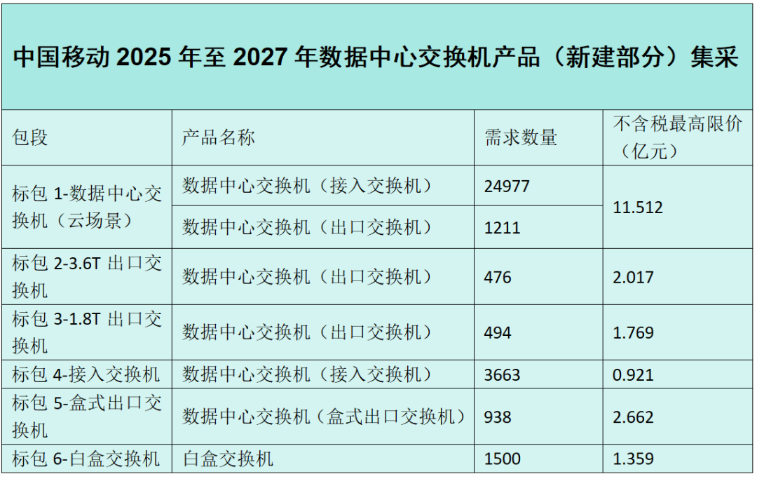 C114讯 5月12日消息(九九)中国移动采购与招标网日前发布2025年至2027年数据中心交换机产品(新建部分)集中采购项目招标公告,预估采购数据中心交换机产品约3.33万台。预计本次采购需求满足期为2年。