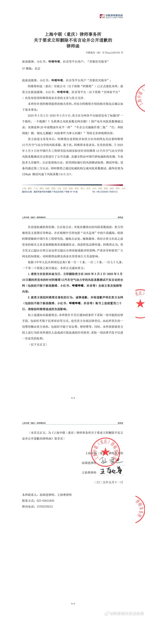 1、请贵方在收到本函当日,立即删除贵方在2025年5月2日-2025年5月10日期间所发布的针对阿维塔12汽车空气动力学的风阻系数测试不实言论的全网(包括但不限于新浪微博、小红书、哩哩、抖音等)全部文章及视频等内容;