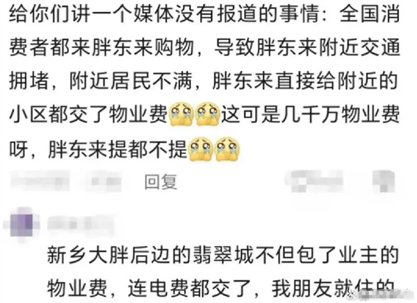 还有网友晒出了具体的小区名字,说新乡大胖后面的翡翠城不但包了业主的物业费,连电费也帮着交了,他朋友就是住在那里。