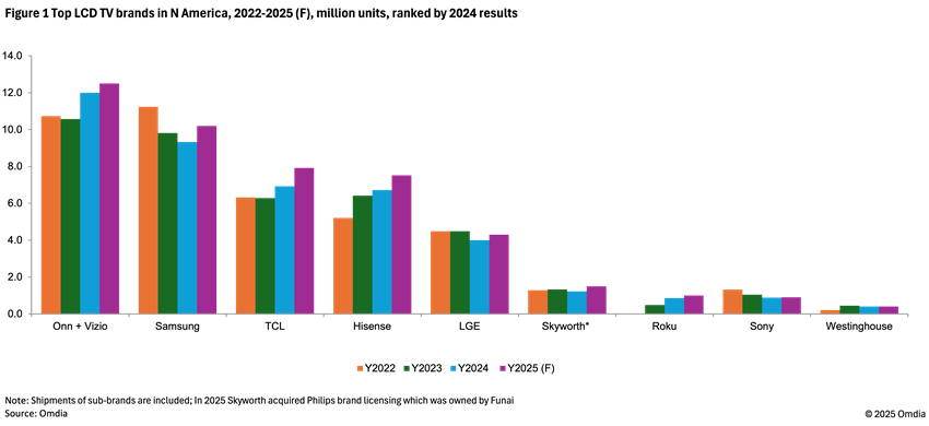 此外,美国本土彩电品牌沃尔玛自有品牌Onn、Vizio等墨西哥获豁免而失去利好。因为Vizio、Onn等品牌非常依赖亚洲供应链,其在美国本土组装产能仅能满足小部分需求。因此,在关税风暴下,就算美国本土彩电品牌Vizio、Onn等也同样遭遇很大的冲击。