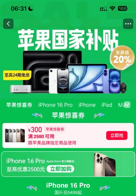 5月12日消息,日前,天猫官微宣布,天猫Apple Store官方旗舰店iPhone 16 Pro直降2000元,还能再享500元国家补贴,到手价5499元起。