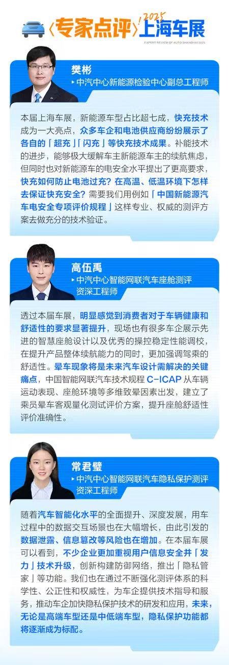 中汽中心新能源检验中心副总工程师樊彬表示,快充技术是本届上海车展亮点,“将快充技术与电池技术结合,在低温环境下做到‘去里程焦虑化’需要我们像‘中国新能源汽车电安全专项评价规程’这样专业、权威的测评方案去做充分的技术验证”。