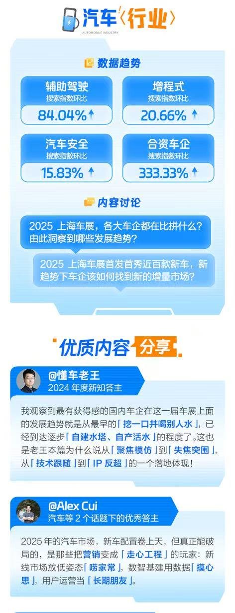 知乎拥有全网最多的汽车领域专业人士,他们来自汽车工程师和产业链从业者们,因而知乎的汽车话题讨论更具专业和深度。此次,知乎与汽车测评国家队”中汽测评共同发布的《2025上海车展洞察报告》,由用户数据、专业讨论和专家洞察共同建构而成,未来,知乎将持续扮演“技术翻译器”与“趋势解码器”角色,成为链接消费者与行业的重要桥梁。