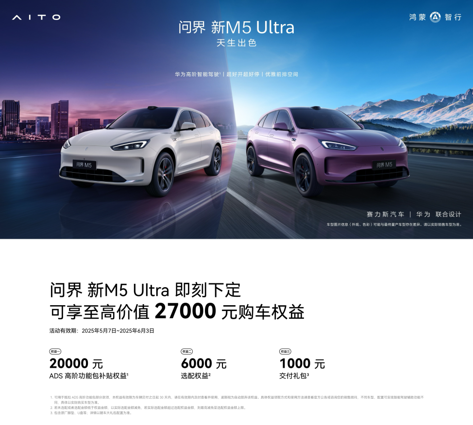 问界新M5 Ultra以智能驾驶、稳健底盘、舒适座舱为核心优势,成为假日自驾的理想选择。无论是都市通勤、城镇穿梭还是山路驰骋,它都能为用户提供安全、舒适且愉悦的驾乘体验。错过五一不必遗憾,抓紧下订,让问界新M5 Ultra陪伴你开启下一段难忘的自驾之旅!