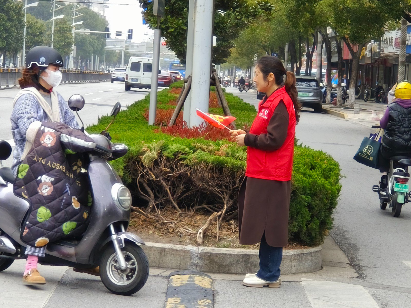 一件红马甲、一面小红旗、一只口哨就是他们的装备,“人行横道请慢走”、“请绿灯亮了再走”、“请在线外等车”、“请走斑马线”,志愿者们积极协助交警引导学生及家长过马路,提醒骑电瓶车人员佩戴头盔,配合维护现场秩序,志愿者们精神饱满、举止端庄、态度和蔼。