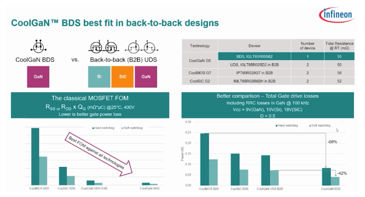 图2:与SI和SIC MOSFET背对背配置的HV Coolgan BDS设备的损耗比较(来源:Infineon Technologies)