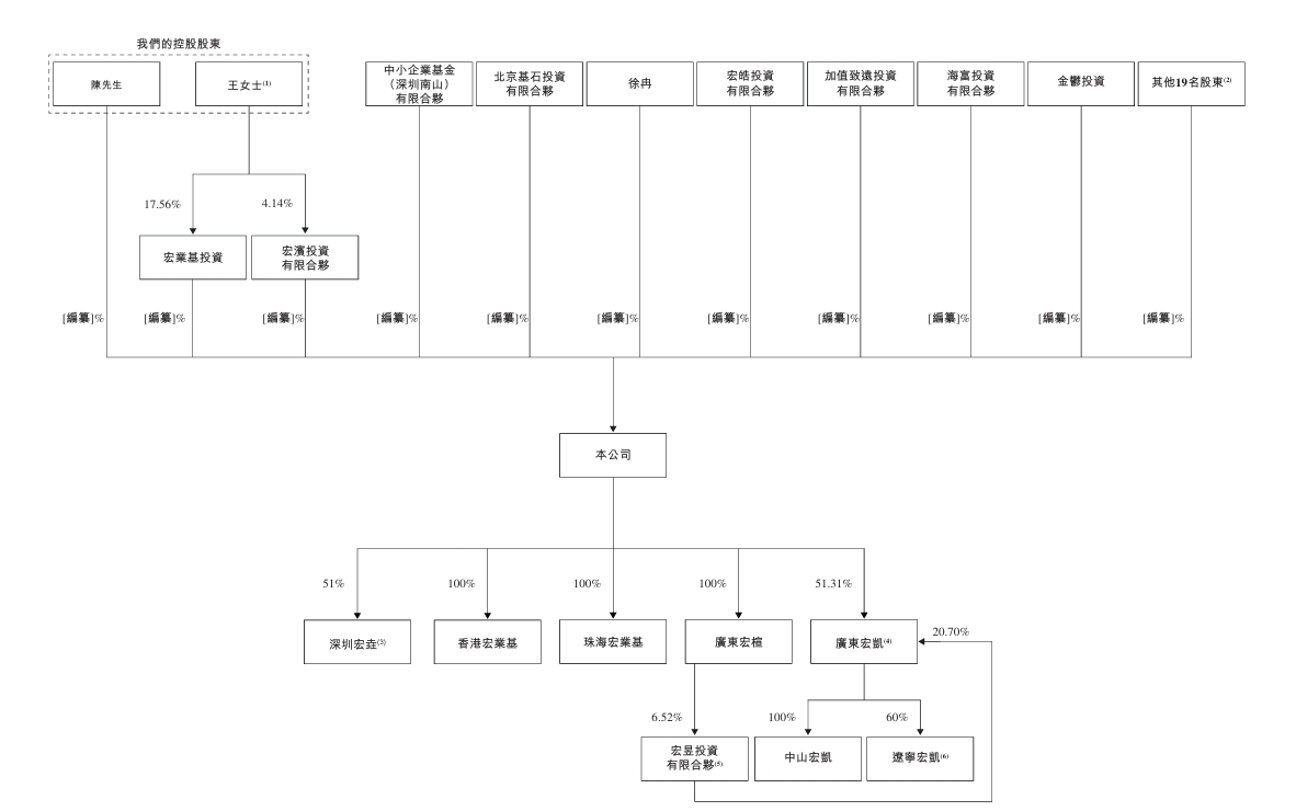 股权结构方面,截至最后实际可行日期,宏业基董事长陈枝国夫妻持股35.65%,为公司控股股东。此外,公司的上市前投资者还包括深圳中小企业基金、北京基石投资、宏皓投资、海富投资、中比投资基金、加值致远投资等。