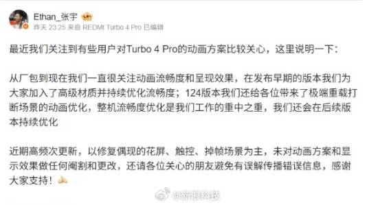 “最近我们留意到一些用户对 Turbo 4 Pro 的动画设计比较关注,在此作一下说明: