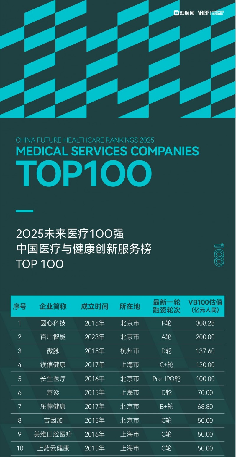 创立于2015年的未来医疗100强榜单是由VB100、动脉网、蛋壳研究院推出的国内第一个针对非上市企业的创新医疗领域榜单,旨在遴选真正代表未来医疗的中国创新医疗者,发现国内未来医疗产业的核心力量,推动健康医疗产业的创新变革进程。目前,“未来医疗100强评选”得到了众多投资机构及企业的大力支持,已经成为医健领域的投资风向标,为创新企业后续融资提供借鉴与参考。
