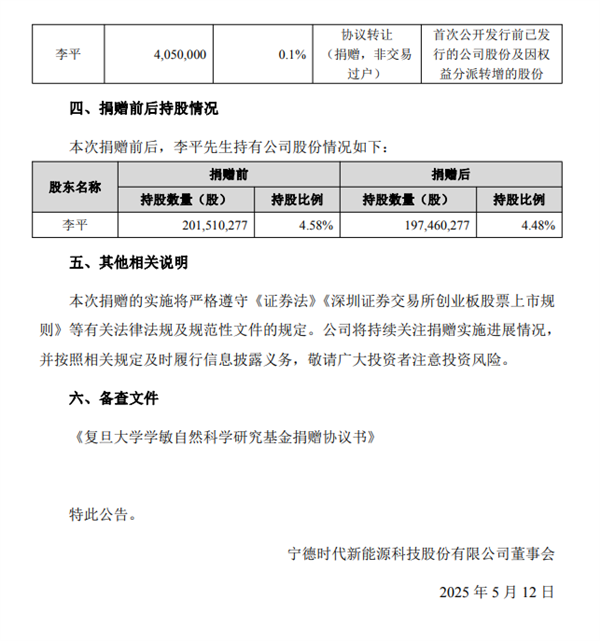 为支持教育事业发展,李平及其配偶与上海复旦大学教育发展基金会签订了《复旦大学学敏自然科学研究基金捐赠协议书》,李平及其配偶拟向基金会无偿捐赠405万股宁德时代无限售流通股股票。