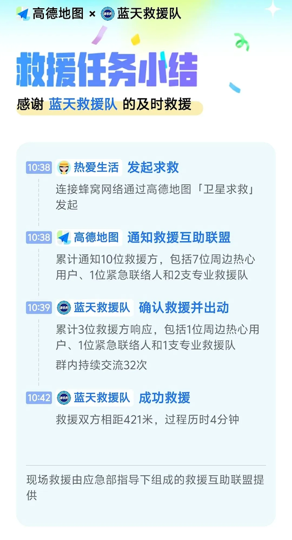 刚刚过去的五一假期,基于卫星求救功能,高德地图救援互助联盟进行7次响应5次有效救援,成功解救人数达9人。