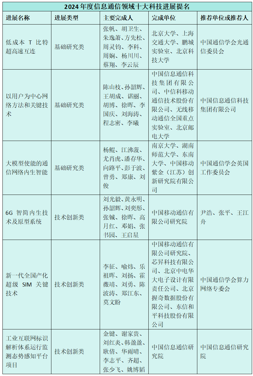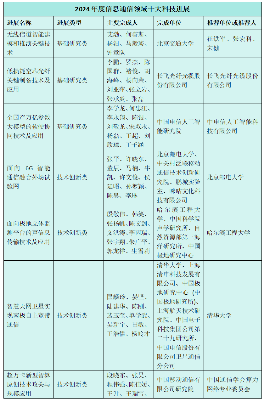 经学会组织专家遴选,最终产生了2024年度信息通信领域十大科技进展和六项进展提名,中国电信人工智能研究院、中国移动通信有限公司研究院等入围。