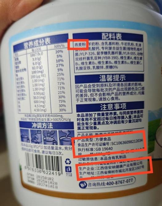 然而,仔细查看可以发现,配料表中第一位是燕麦粉,其产品类型还是“方便食品”,不属于乳粉或调制乳粉产品。