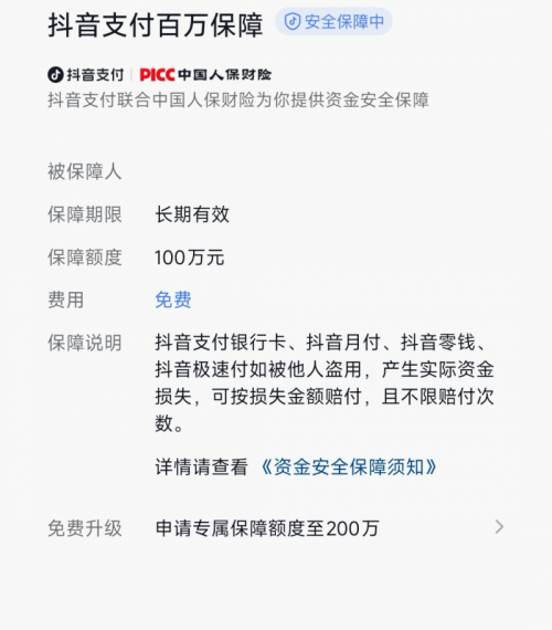 在考虑用户支付的便捷性的同时,抖音支付也非常注重用户的安全保障,为此抖音支付联合中国人保,为所有开通了抖音支付的用户开通了长期免费的“百万保障”服务,为用户提供资金安全保障。如果账户出现被人盗用产生资金损失,可按损失金额进行赔付,且不限赔付次数,最高可赔付100万。