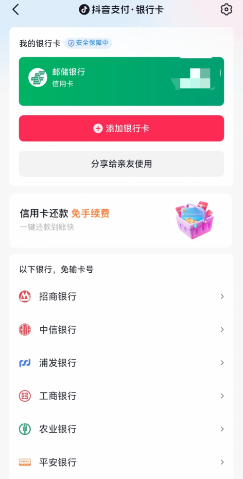 目前抖音支付和400+银行(含70+家支持免卡号绑卡)有合作。用户只需在抖音支付界面绑定添加银行卡或信用卡,绑卡成功后即可使用抖音支付进行付款,新人首次绑卡更可获得5-20元不等的立减券。
