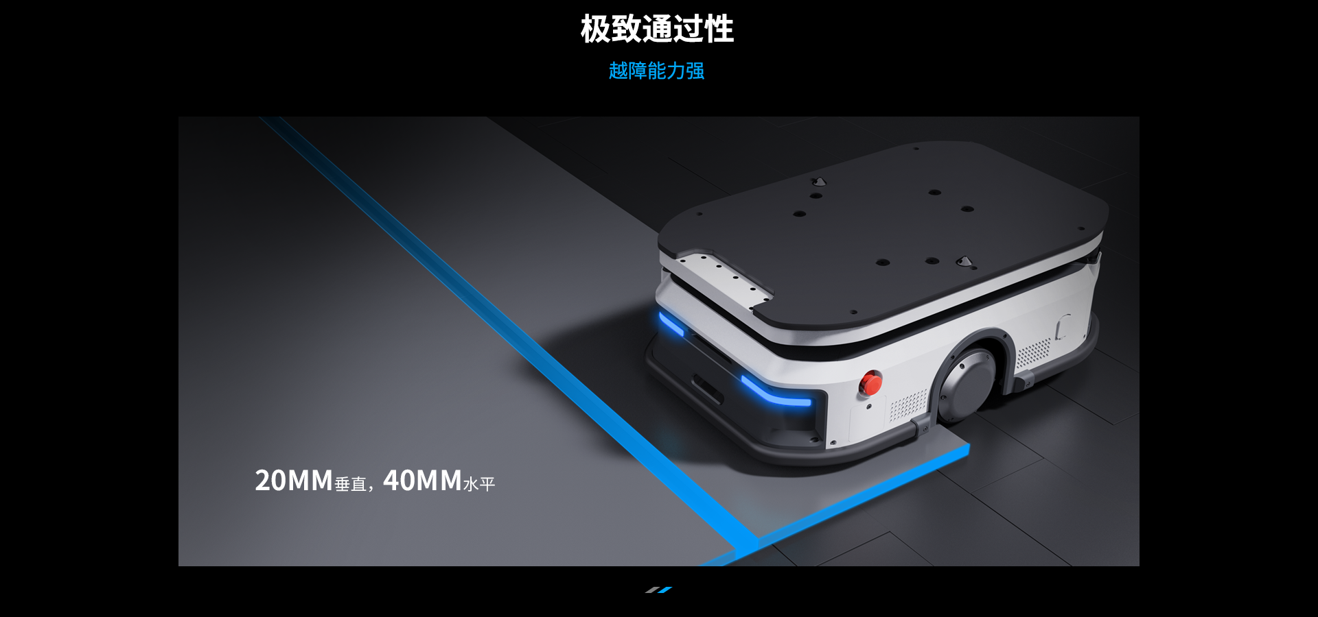 60cm窄道自由通行:无货架模式下可通过60cm狭窄通道,垂直20mm、水平40mm越障能力,适应复杂工业场景。