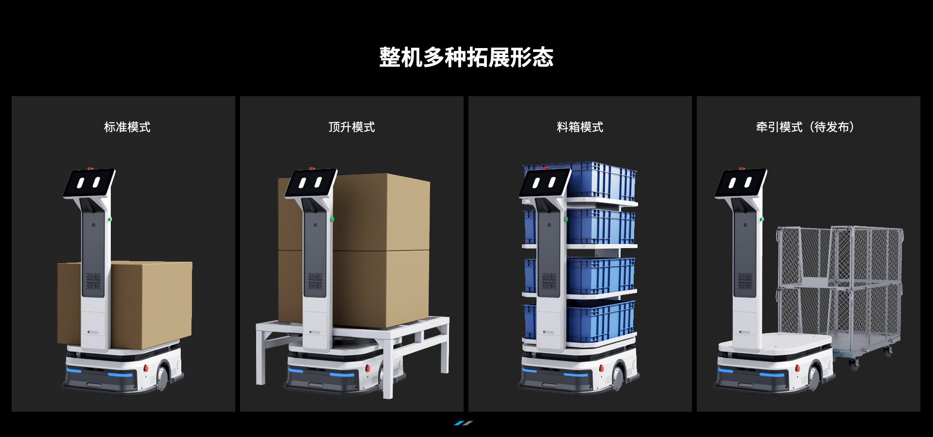 硬件灵活扩展:提供纯底盘交付,开放上位机接口及模型图纸,支持标准、顶升、料箱、牵引等多种形态,用户可自定义整机结构。