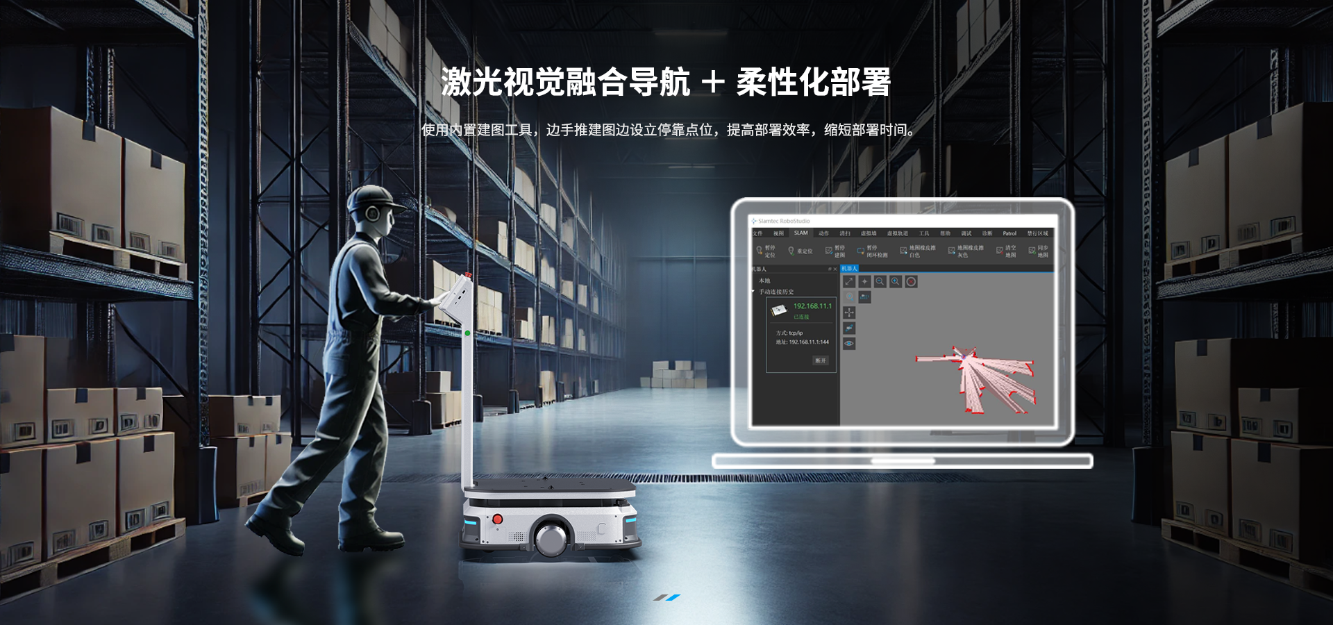 无需复杂部署:摒弃传统磁铁、反光板等环境改造,通过激光视觉融合技术快速建图,边推图边设点,部署效率提升50%。