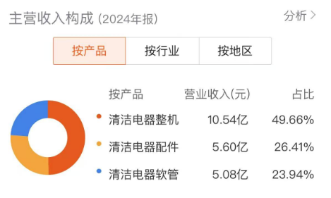 除整机产品外,春光科技的清洁电器配件、清洁电器软管等产品同样表现不俗。2024年,上述两款产品实现营收5.60亿元、5.08亿元,同比分别增长5.66%、16.74%。