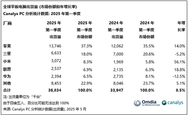 根据Canalys最新发布的2025年第 一季度全球平板电脑市场报告,全球平板电脑出货量同比增长8.5%,达到3680万台。大中华区成为本季增长核心引擎,在政府消费补贴政策延续及农历新年促销的叠加效应下,区域需求呈现两位数增长,推动整体市场升温。