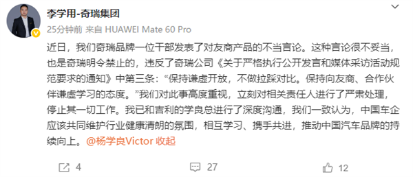 近日,我们奇瑞品牌一位干部发表了对友商产品的不当言论。