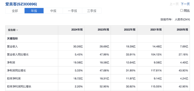 连续高速增长这么多年后,爱美客2024年终究还是绷不住了。全年实现营业收入 30.26 亿元,同比增长 5.45%;归母净利润 19.58 亿元,同比增长 5.33%;扣非归母净利润 18.72 亿元,同比增长 2.20%。