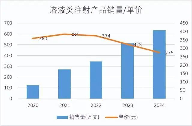 此前嗨体最大的亮点就在于多年以来都是国内唯一一款获批用于颈纹修复的产品,不过这一情况也在2024年7月被终结,华熙生物用于颈纹修复适应症的“润致格格针”获批上市。近些年来,爱美客的溶液类注射产品(其实就是玻尿酸)单价一直在下跌,好在价跌有换来量的增长,所以玻尿酸2024年依然整体实现了增长,2024年全年收入17.44亿,同比+4.4%。