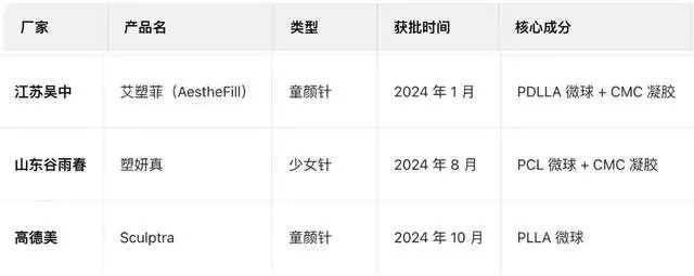 以天使针为代表的再生医美产品的竞争虽然不像玻尿酸那样激烈,但这几年也明显变卷,2024年以前一直都是爱美客、华东医药、长春圣博玛三家竞争,但自2024年起,类似竞品陆续获批了,2024年有三个厂家同类产品获批,这还不包括锦波生物的胶原蛋白以及摩漾生物的羟基磷灰石,这两者都有再生能力,虽然成分不同各有特点,但在一定程度上也会构成竞争关系。