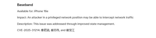 该漏洞编号为CVE-2025-31214,该漏洞可能允许"处于特权网络地位"的攻击者拦截网络流量,实施监控或中间人攻击,苹果通过改进状态管理解决该漏洞。