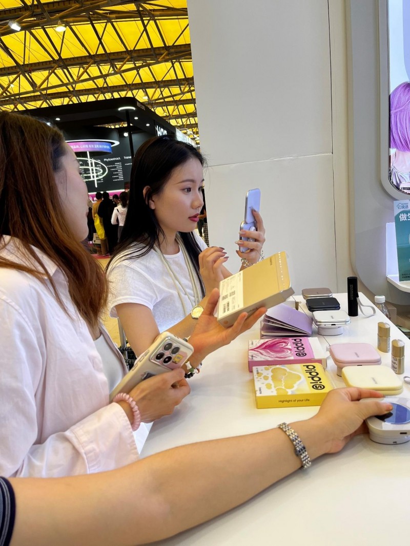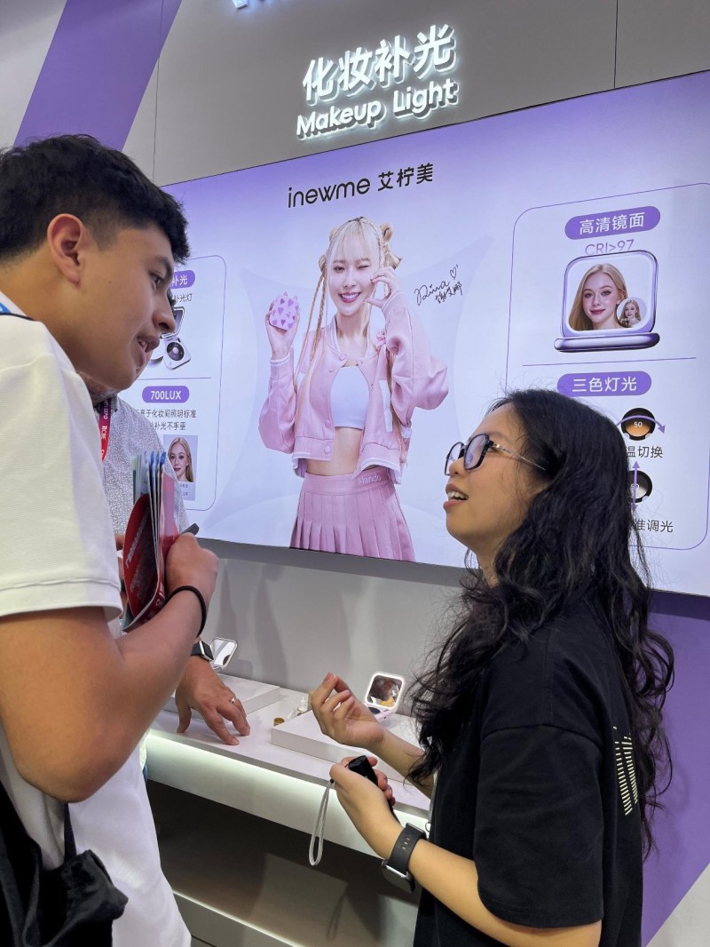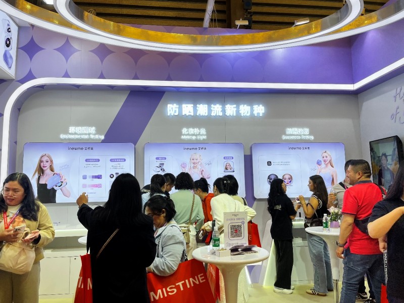 走进美博会艾柠美展位,以 “紫银渐变” 为主色调的未来感空间设计在现场众多展位中脱颖而出。艾柠美小紫镜、艾柠美小梦镜两款产品在展位现场吸引了众多观众体验试用,为了提升用户体验,展位设置了环境检测、化妆补光、防晒检测三个区域。