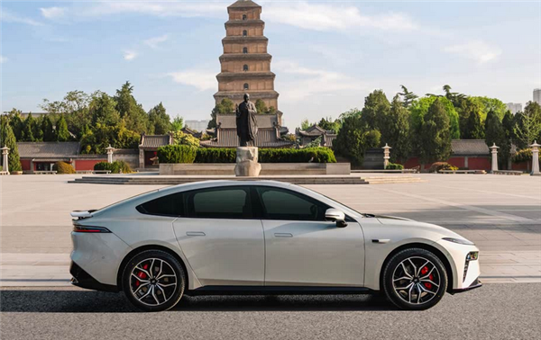 车身侧面线条流畅,呈现出轿跑风格,配备隐藏式门把手、无框车门和红色刹车卡钳,运动感强烈。