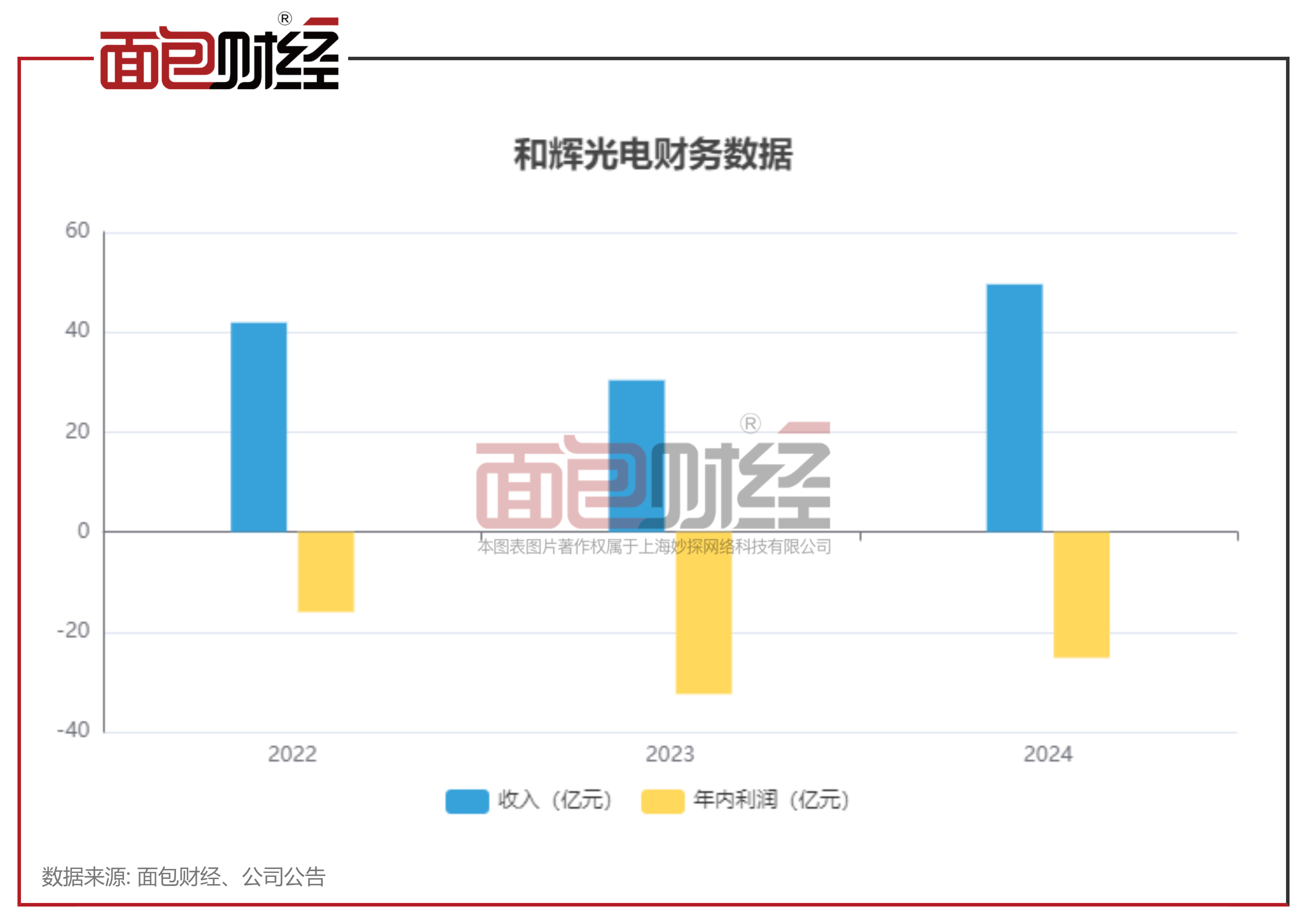 财务数据方面,和辉光电长期处于亏损状态。2024年,公司实现营收49.58亿元,同比增长63.19%;年内亏损25.18亿元。从2022年至2024年,公司合计亏损73.64亿元。